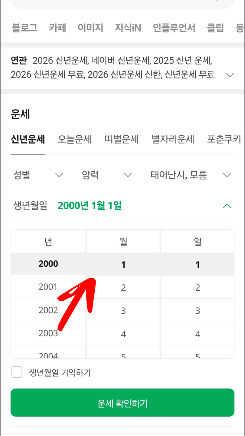 - 3. 상단에 뜨는 운세 섹션에서 신년 운세, 띠별, 별자리, 사주, 궁합 중 신년 운세를 고르고 성별, 생년월일, 태어난 시를 입력합니다.