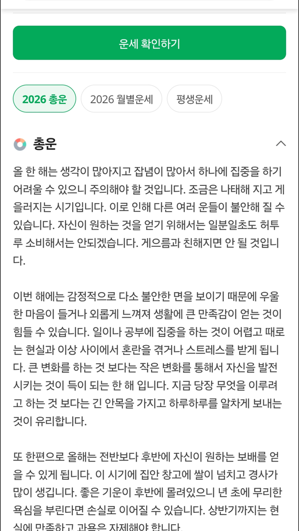 네이버 운세의 특징은 접근성과 다양성입니다. 신년운세는 물론, 주간·월간·오늘의 운세까지 모두 포함되어 있으며, 생년월일·태어난 시간으로 계산하는 정통 사주 알고리즘을 사용합니다. 또한, 무료 서비스임에도 상세한 운세풀이를 제공해 가볍게 보기 좋습니다.