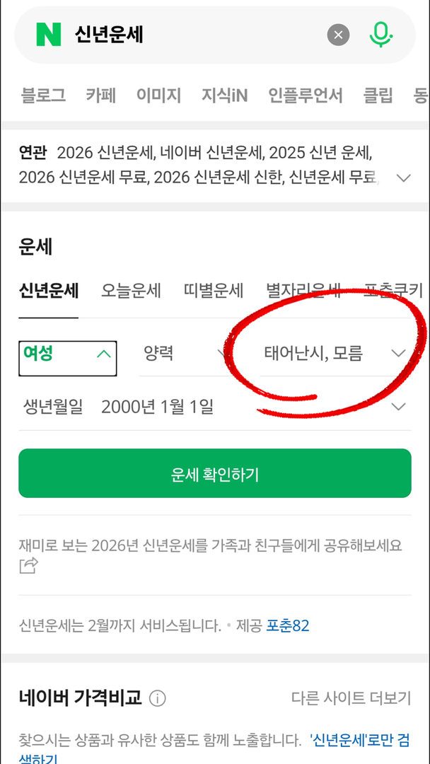 간혹 태어난 시를 모르는 분들이 계신데 네이버 운세에서는 태어난 시를 이력하지않아도 운세 검색이 가능합니다.